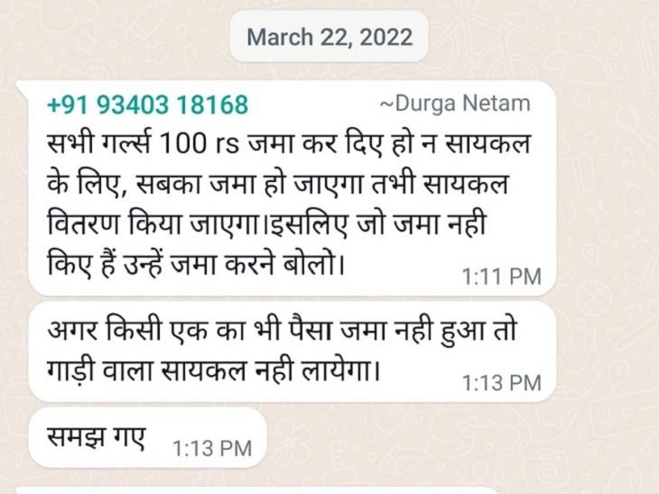प्राचार्य ने व्हॉट्सऐप ग्रुप में एक-एक कर तीन पोस्ट किए हैं। पहले पोस्ट में लिखा है कि सभी का पैसा जमा होने पर ही साइकिल वितरण किया जाएगा। जिन छात्राओं ने पैसा जमा नहीं किए हैं उन्हें जमा करने का बोलो। दूसरे पोस्ट में लिखा है कि अगर किसी एक का भी पैसा जमा नहीं हुआ तो गाड़ी वाला साइकिल नहीं लाएगा। तीसरे पोस्ट में ‘समझ गए’। हालांकि छात्राओं को स्कूल तक मुफ्त साइकिल दी जानी है, लेकिन वाहन वाले के नाम से वसूली की जा रही है।