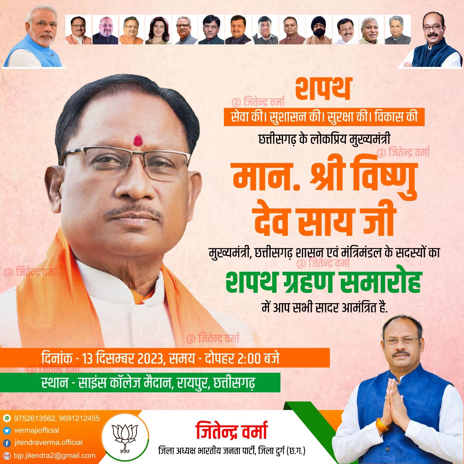 जिला भाजपा अध्यक्ष जितेन्द्र वर्मा ने दुर्ग शहर, दुर्ग ग्रामीण, अहिवारा और पाटन विधानसभा के प्रमुख पदाधिकारियो एवं वरिष्ठ नेताओं से चर्चा करके दुर्ग संगठन जिले से अधिक से अधिक संख्या में कार्यकर्ताओं को शपथ ग्रहण में शामिल होने का आव्हान किया। इसके लिए दुर्ग जिला अंतर्गत समस्त मंडल अध्यक्षों एवं मोर्चा प्रकोष्ठों के कार्यकर्ताओं को जिम्मेदारी सौंपी। शपथ ग्रहण समारोह में दुर्ग संगठन जिला की उपस्थिति ऐतिहासिक रहे, इसके लिए सभी जिला पदाधिकारी को आवश्यक दिशा निर्देश जिला भाजपा अध्यक्ष जितेन्द्र वर्मा द्वारा दिए गए।