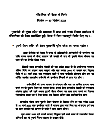 मुख्यमंत्री भूपेश बघेल की अध्यक्षता में शुक्रवार को श्री निवास कार्यालय रायपुर में कैबिनेट की बैठक आयोजित की गई। इसमें कई अहम फैसले के लिए गए। सरकारी कर्मचारियों के लिए पुराने पेंशन खाते को लेकर तालिका में बड़ा मास्टर स्थान लिया गया। इसके तहत राज्य के अधिकारियों-कर्मचारियों के लिए एनपीएस की राशि वापस करने के लिए केंद्र सरकार के मना करने के बावजूद पुरानी पेंशन योजना का लाभ देने का फैसला लिया गया। यह भूपेश सरकार का अब तक का सबसे बड़ा फैसला है।