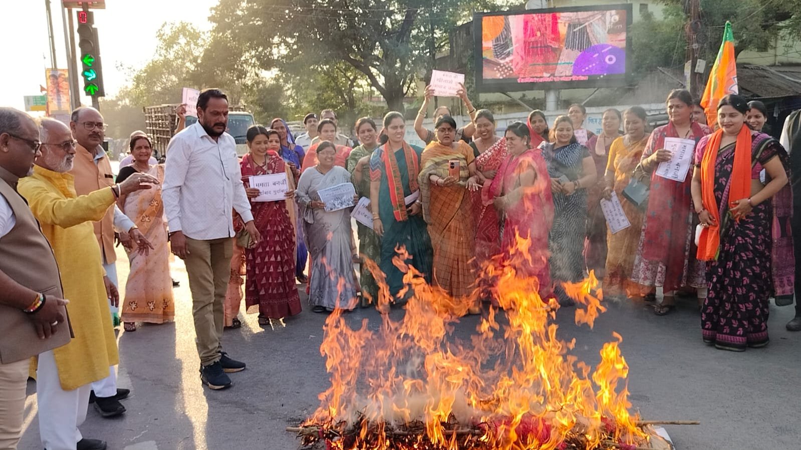 तहलका न्यूज दुर्ग// पश्चिम बंगाल स्थित संदेशखाली में महिलाओं के साथ जिस तरह से लगातार अनाचार व यौन उत्पीड़न की घटनाएं हो रही हैं उसे देखते हुए पश्चिम बंगाल की महिला मुख्यमंत्री ममता बनर्जी के द्वारा कोई ठोस कार्रवाई नहीं करना, जिसकी वजह से लगातार इस तरह की अपराधिक गतिविधियों के कारण पश्चिम बंगाल की आम जनता परेशान है, जिसे देखते हुए आज भाजपा महिला मोर्चा जिला अध्यक्ष दिव्या कलिहारी के नेतृत्व में विरोध प्रदर्शन कर दुर्ग स्थित पटेल चौक में पश्चिम बंगाल की मुख्यमंत्री ममता बनर्जी का पुतला दहन किया गया, और मांग की गई की जल्द से जल्द पश्चिम बंगाल में अपराधिक गतिविधियों पर रोक लगाये और अपराधियों पर कड़ी से कड़ी कार्रवाई की जाए अगर जल्द पश्चिम बंगाल में कानून व्यवस्था सुचारू रूप से नहीं चलाई गई तो केंद्र सरकार से अपील की गई कि वहां राष्ट्रपति शासन लगा दिया जाए।