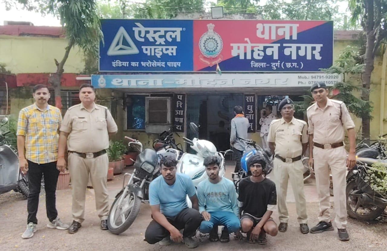 तहलका न्यूज दुर्ग // अलग-अलग जगह पर खड़ी मोटरसाइकिल की चोरी करने वाले तीन आरोपियों को मोहन नगर पुलिस ने गिरफ्तार किया है। आरोपियों को गिरफ्तार कर न्यायालय में पेश किया गया। पुलिस में आरोपियों के पास से तीन वाहन जब्त की है।