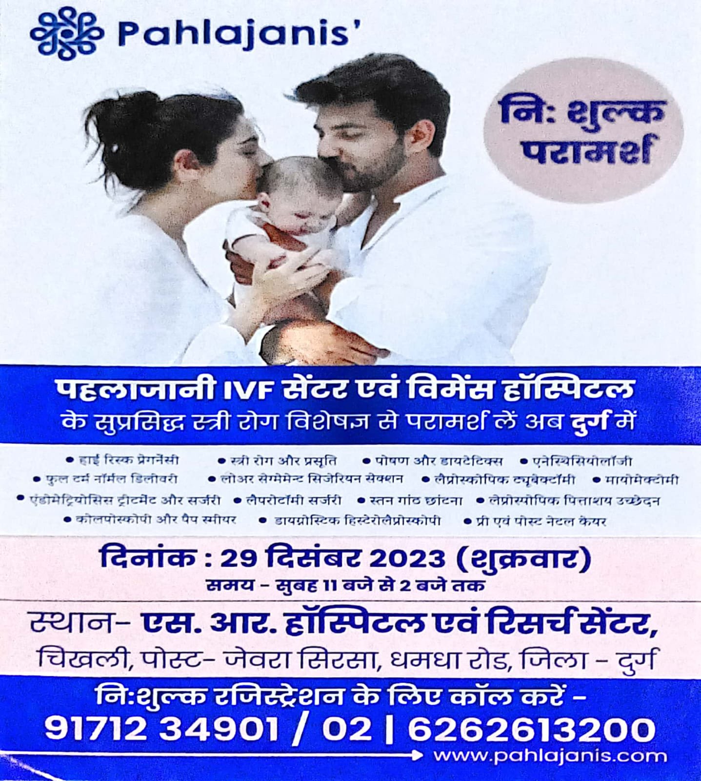 तहलका न्यूज दुर्ग// एस.आर. हॉस्पिटल एंड रिसर्च सेन्टर चिखली धमधा रोड़ दुर्ग एवं पहलाजानी I.V.F. सेन्टर के सयुंक्त तत्वाधान में आज सुबह 11 बजे से 2 बजे तक निःशुल्क स्वास्थ्य परीक्षण शिविर का आयोजन किया गया है ।