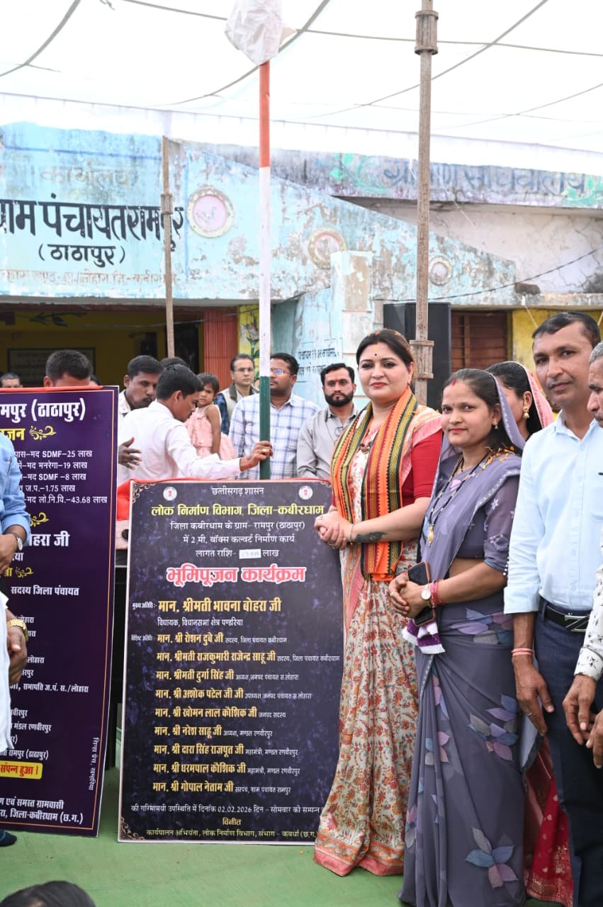 भावना बोहरा ने कहा कि पुल-पुलिया, सीसी रोड, नाली निर्माण, जल संरक्षण संरचनाएं, स्टापडेम और चेकडेम जैसे कार्यों से ग्रामीण अधोसंरचना मजबूत हुई है। इन विकास कार्यों से खेती, जल प्रबंधन और गांवों की आंतरिक कनेक्टिविटी में सुधार हुआ है, जिससे समग्र ग्रामीण विकास को गति मिली है। आज पंडरिया विधानसभा का हर गांव विकास की राह पर अग्रसर है। इस अवसर पर मंडल अध्यक्ष  नरेश साहू, महामंत्री  दारा सिंह, जिला मंत्री राघवेंद्र वर्मा, सरपंच  गोपाल नेताम, जनपद सदस्य प्रतिनिधि पिंटू सिंह,  रूखमणि खोमलाल कौशिक सहित भाजपा कार्यकर्ता, पदाधिकारी, जनप्रतिनिधि एवं ग्रामवासी उपस्थित रहे।