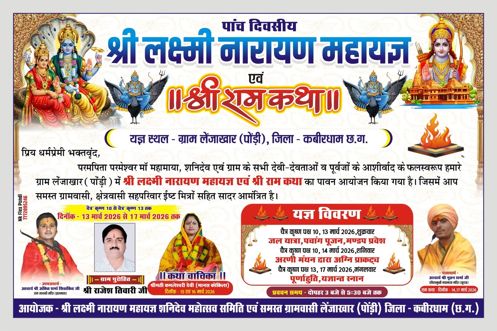 कबीरधाम (छत्तीसगढ़) – ग्राम लेंजाखार (पोंड़ी) में 13 मार्च से 17 मार्च 2026 तक पाँच दिवसीय लक्ष्मी-नारायण महायज्ञ एवं राम कथा का भव्य आयोजन किया जा रहा है। यह धार्मिक आयोजन लक्ष्मी नारायण महायज्ञ शनिदेव महोत्सव समिति एवं ग्राम के समस्त ग्रामवासियों के सहयोग से आयोजित किया जा रहा है।