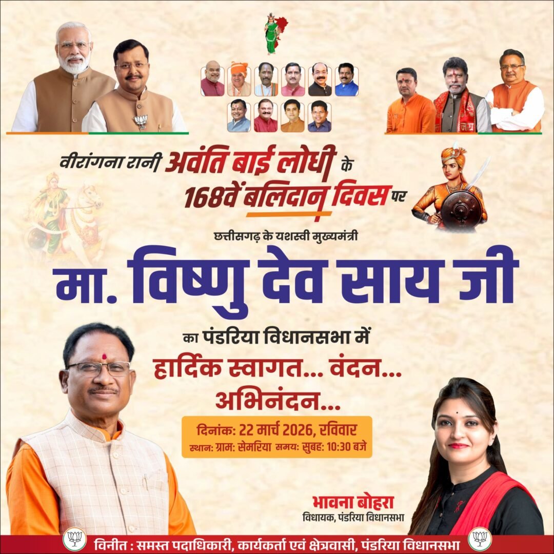 Kawardha. पंडरिया विधानसभा अंतर्गत ग्राम सेमरिया में वीरांगना रानी अवंती बाई लोधी के 168वें बलिदान दिवस पर भव्य कार्यक्रम का आयोजन किया गया। इस अवसर पर मुख्यमंत्री विष्णु देव साय का आगमन हुआ, जहां विधायक भावना बोहरा ने उनका आत्मीय स्वागत किया।